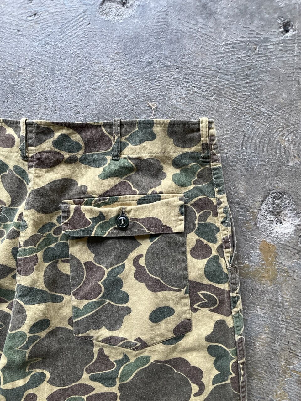 | 商品の特徴 | 60s 〜 Baker Pant Duck Pattern ダックハンター 60s 〜 Baker Pant。60s 〜 Baker Pant Duck Pattern ダックハンター 60s 〜 Baker Pant。vintage】60's 「VKK」duck hunter camouflage pants 60年代頃のダック。60s 〜 Baker Pant Duck Pattern ダックハンター ベイカーパンツジップがアルミのグリッパーのピンロック60年代前後のハンティングパンツになります近年希少価値も上がり、値段も高騰してきていますユーズドになり多少の使用感、ステッチ抜けはございますが、大きなダメージなく状態は良好古着にご理解ある方のみご検討くださいSIZE Lウエスト 48.5 (平置きにて)股下 71そう丈 100.5裾幅 21.5ワタリ 33.5素人採寸のため多少の誤差はご了承下さい。。60s 〜 Baker Pant Duck Pattern ダックハンター 60s 〜 Baker Pant | ||