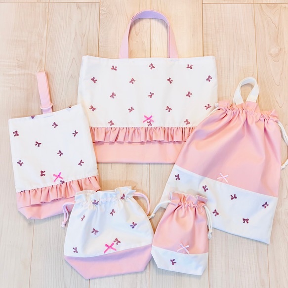 masako 入園入学進級グッズ リボン刺繍 レッスンバッグ 女の子 入園入学グッズ 5点セット 刺繍リボン✖️ピンク レッスンバッグ Mimi